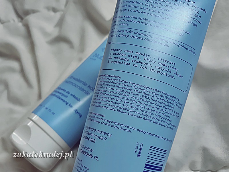 Moja opinia: Kosmetyki są zamknięte w wygodnych, plastikowych opakowaniach. Szampon ma 250ml, z kolei odżywka 200ml. Na tubkach czekają na nas podstawowe informacje takie jak sposób użycia czy skład kosmetyku. Konsystencja szamponu jest lekko perłowa, nie jest ani za gęsta, ani zbyt rzadka, z kolei odżywka ma jasny kolor i jest trochę bardziej treściwa. Oba produkty pachną przepięknie. Jeżeli lubicie zapach wiśni to ta seria na pewno Wam się spodoba :) Aromat jest najintensywniejszy podczas używania, ale włosy pachną wiśniami jeszcze długo po ich umyciu. Ja się w tym zapachu totalnie zakochałam i z tego powodu jeszcze częściej sięgałam i po szampon i po odżywkę. Szampon dobrze oczyszcza włosy i całkiem porządnie się pieni. Do ich umycia wystarczy mi zawsze jedno porządne „szorowanie”. Co dla mnie ważne — nie plącze włosów i ich nie przesusza, nie miałam też później żadnych problemów z swędzącą skórą głowy itp. Po użyciu szamponu zawsze nakładam odżywkę - trzymam ją na włosach maksymalnie 5 minut, próbowałam i dłużej i krócej, ale efekt zawsze był taki sam. Moje włosy się z nią polubiły, przy aplikacji dosłownie ją „piją”, a efekty czuć już podczas spłukiwania. Włosy po użyciu są lejące, przyjemne w dotyku i bardzo gładkie. Gdy używam tego duetu, nie mam też problemu z puszeniem się włosów i nie wywijają się w każdą stronę :) Zauważyłam również, że te kosmetyki faktycznie nie wypłukują farby z włosów, ale nie jest to na tyle spektakularny efekt, żebym mogła zrezygnować z wizyty u fryzjera — wiadomo :)